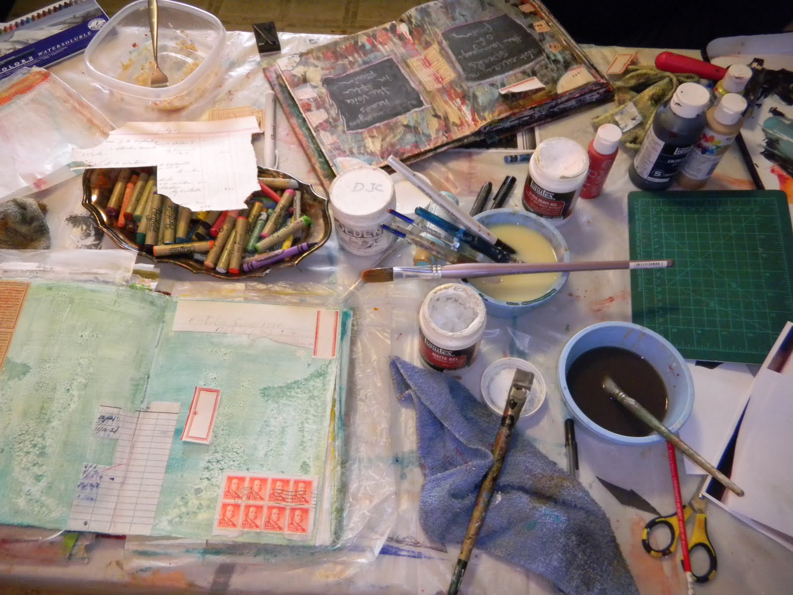 I needed a break from preparing for my upcoming show and my friend Shelby needed a dose of adult play time, so we got together for a few hours last night to play in our visual journals. We started with some blank pages . . . and from nothing created something.